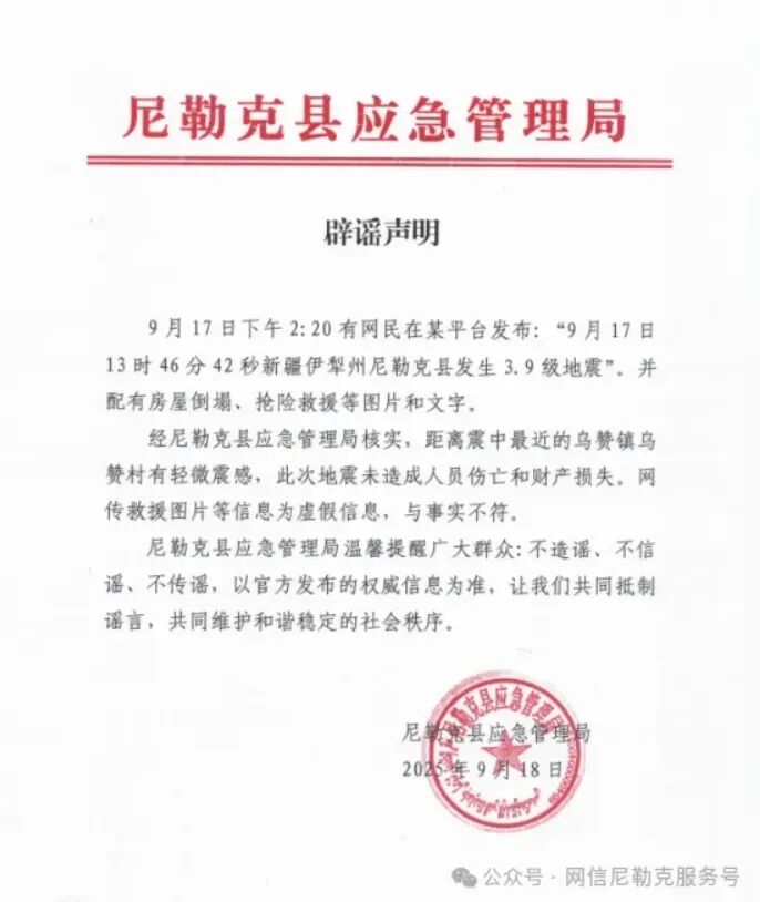 中国地震台网信息,2025年09月17日13时46分42秒在新疆伊犁州尼勒克县(北纬44.0度,东经82.68度)发生3.9级地震,震源深度19公里。经尼勒克县应急管理局初步核实未造成人员伤亡和财产损失。