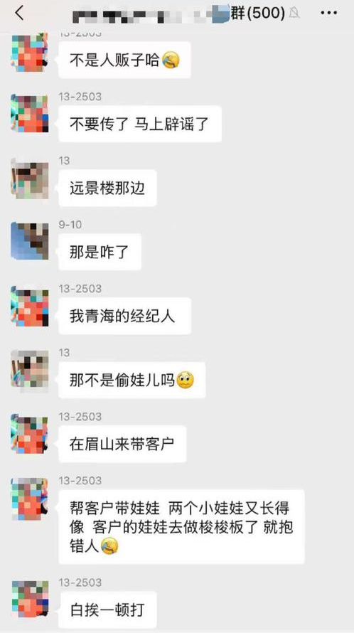 公安发布的辟谣信息显示:警方查明,9月24日19时30分许,青海来眉人员李某(女))委托同行人员杨某兰(女,青海人)、李某云(女,青海人)帮忙照看其2岁儿子李某航。其间,杨某兰、李某云将李某航带至远景楼附近玩耍。同一时间,眉山当地人员周某文(男)带其2岁孙子李某棋在远景楼同一区域游玩。玩耍一段时间后,周某文欲带孙子离开,因李某航与李某棋身高、体态、衣着高度相似。杨某兰、李某云误认为周某文带走的是其帮忙照看的李某航,故上前阻止,而周某文则误认为杨某兰、李某云欲抢夺其孙子,随即双方发生纠纷,导致群众误解并报警。经警方核实后,双方误会已消除,并相互表达歉意。