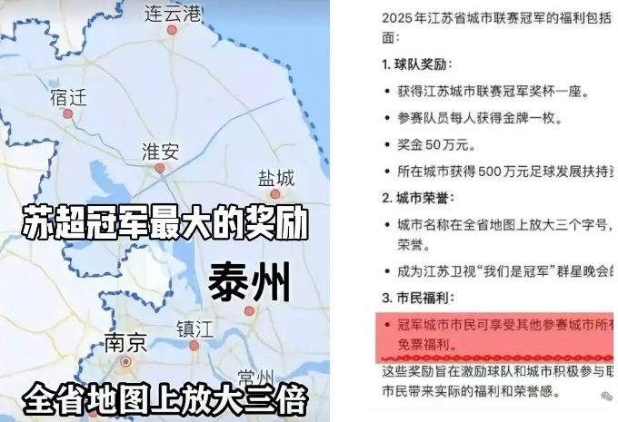 2.全省景区免票一年:纯属网友脑补。但泰州队勇夺冠军后,泰州文旅发放“免门票+超值福利”文旅优惠大礼包,诚邀全球游客。(链接:《泰州官宣:全球免费!)官方只给了泰州本地面向所有游客的优惠福利,别再传错啦。