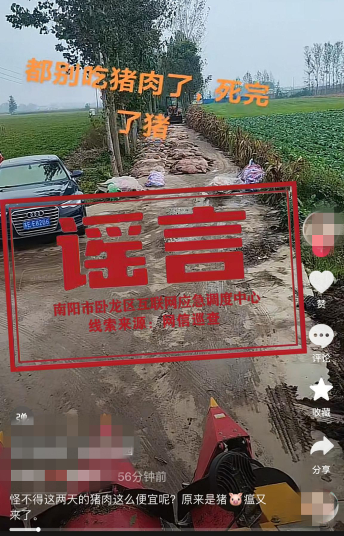 真相:10月16日,网信部门巡查发现,有网民发布视频称“怪不得猪肉这么便宜,原来是猪瘟又来了”,画面中有大量死猪,定位地在南阳市卧龙区七里园街道某处,引起网民关注。经查,该区域并未发生相关事件,该消息系不实信息。卧龙区互联网应急调度中心、卧龙区公安分局及七里园街道联合对视频发布者进行批评教育。目前,相关视频已删除。