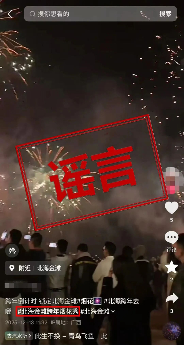 近日,有网友在社交媒体发布消息称“北海金滩跨年夜有烟花秀”“北海金滩跨年夜可燃放烟花”,引发市民及游客关注。