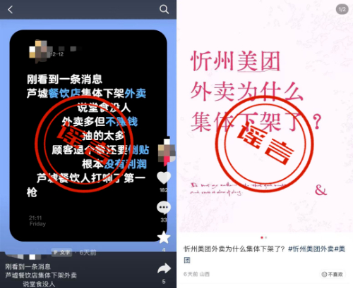 “商家集体下架外卖平台”的谣言通过制造商家与外卖平台对立,在短时间内以极低成本获取了巨大流量。如从12月12日起,先后出现江苏苏州芦墟、山西忻州外卖集体下架等谣言变体,经核实苏州当地外卖市场正常运行,忻州系因突发暴雪恶劣天气,外卖平台为保护骑手安全,防止出现人身安全风险,临时推出暂时置休商家、限制配送范围的保护举措。