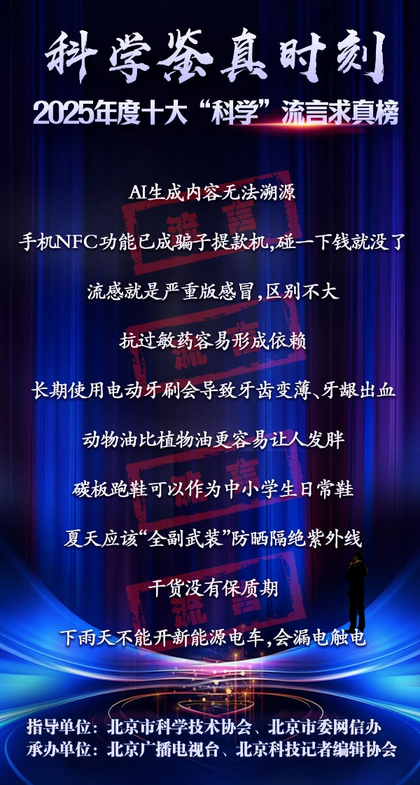 12月31日,“科学鉴真时刻——2025年度十大‘科学’流言求真榜”在京发布。该活动由北京市科学技术协会、北京市委网信办指导,北京广播电视台、北京科技记者编辑协会承办。现场特邀权威专家组成科普团队,针对网络热议的年度十大“科学”流言进行深度剖析与辟谣,助力公众提升信息甄别能力。