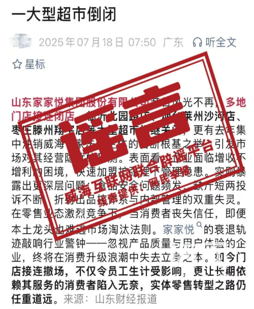 7月18日,部分自媒体账号发布“一大型超市倒闭”信息,称家家悦集团接连闭店,经营状况衰退,并称消息来源“山东财经报道”。当日,“山东财经报道”微信公众号发布声明,称未发布相关报道及消息。有关部门证实,家家悦集团经营状况正常,门店调整属正常业务调整。
