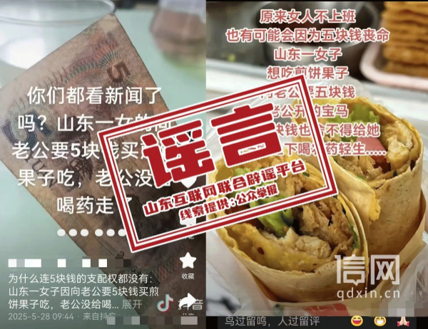 五月份,网传一则关于“山东一名女子向丈夫索要5元钱买煎饼果子当早餐遭拒后,选择喝药轻生”的信息,引发网友对男女平等、婚姻问题的广泛讨论。省内各地和有关部门均证实,并无相关事件记录。
