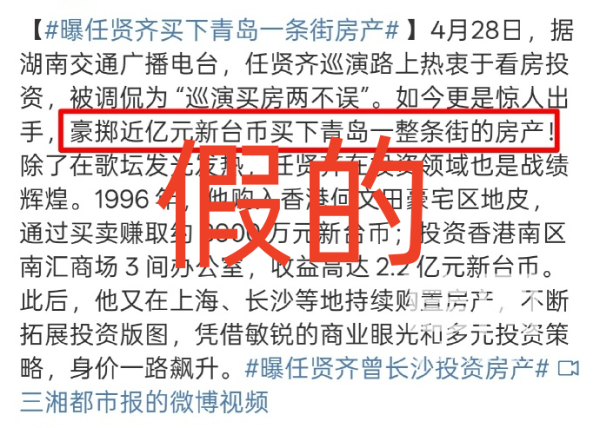 4月28日,有媒体爆料称任贤齐花亿元新台币买下青岛一整条街的房产。有网友称,按照汇率,1亿元新台币换算成人民币大概2000余万元,2000万元想买下一整条街可能性不大。任贤齐经纪人已否认该媒体爆料的内容。