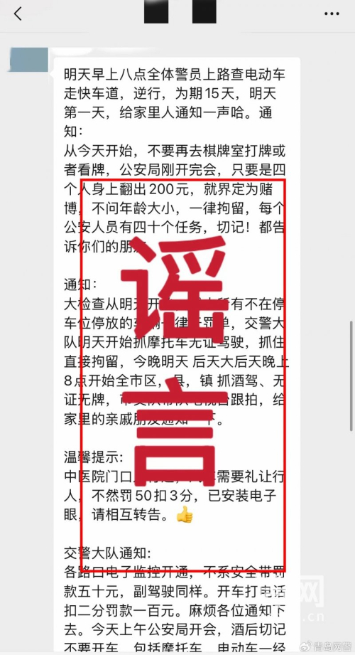 一月份,一则“交警全城大检查”消息在社交媒体广泛传播。该消息称,只要四个人身上翻出200元就视为赌博,一律拘留。网络搜索发现,该谣言在全国多地传播且多地网警已辟谣,属于典型的“旧谣新传”。