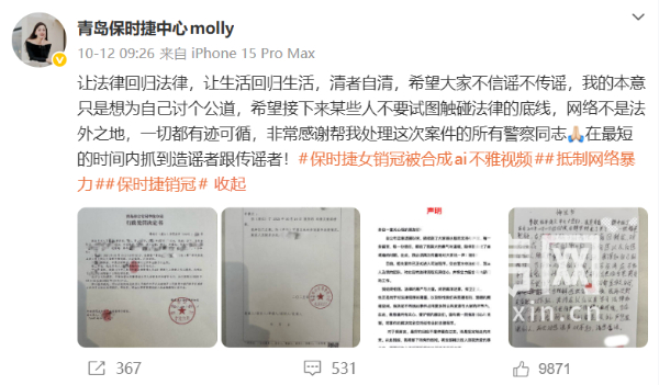 十月份,青岛保时捷销售中心牟女士称,近期发现由AI恶意合成的虚假不雅视频,除此之外,牟女士还遭遇了骚扰电话“轰炸”,微信也收到许多不明添加好友申请。10月12日,青岛市公安局李沧分局对微信群中传播不雅视频的网友予以行政处罚。