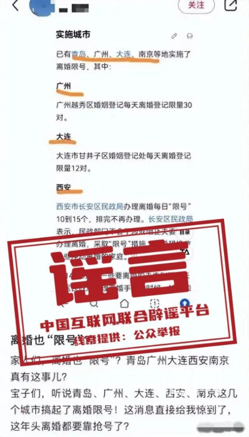 年初,网传青岛等多个城市婚姻登记处对离婚业务进行数量限制。经求证,各地均不存在“离婚限号”。调查发现,网上“离婚限号”的消息多为2013至2014年,个别区域民政部门采取临时领号排队措施,其实是为缓解人流过多,且已是十多年前。