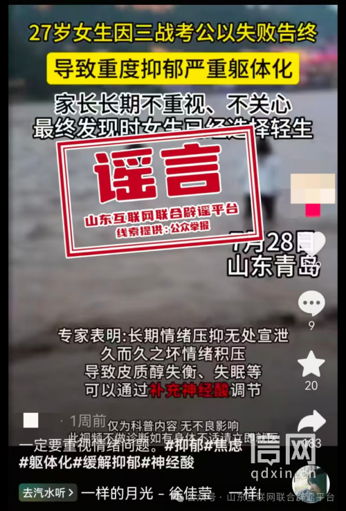 7月28日,一账号在某社交平台发布视频,配文称“山东青岛,27岁女生因三战考公以失败告终,导致重度抑郁严重躯体化,家长长期不重视不关心,发现时女生已选择轻生”。山东省内各地均进行了辟谣,网传信息不实。