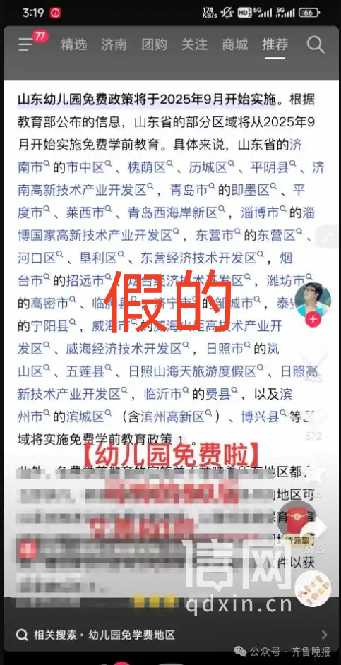 二月份,“山东省的部分区域将从2025年9月开始实施免费学前教育”在多个短视频及社交平台流传,引发大量关注。山东省学前教育中心工作人员表示,并未收到2025年实施免费学前教育的相关文件,网传信息不实。