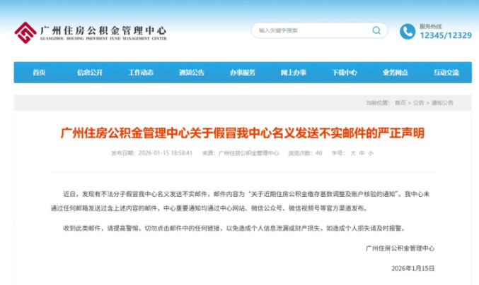 广州住房公积金管理中心表示,该中心未通过任何邮箱发送过含上述内容的邮件,中心重要通知均通过中心网站、微信公众号、微信视频号等官方渠道发布。“收到此类邮件,请提高警惕,切勿点击邮件中的任何链接,以免造成个人信息泄漏或财产损失,如造成个人损失请及时报警。”