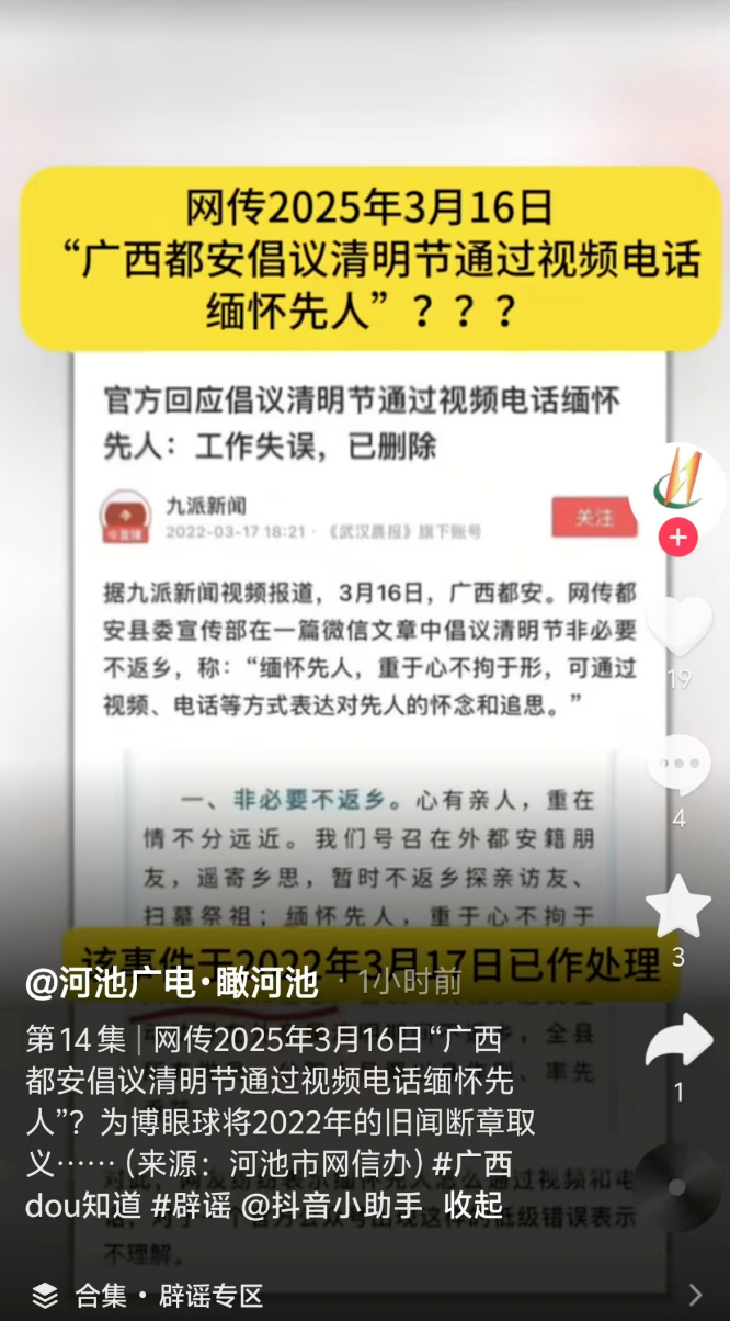事实上,这是一则翻炒旧闻的不实信息,相关事件发生于2022年:当时为配合疫情防控需要,河池市都安县发布了非必要不返乡、线上缅怀的倡议,后因工作人员工作失误造成网民误解,事发后已及时整改,并更正信息内容和重新发布。