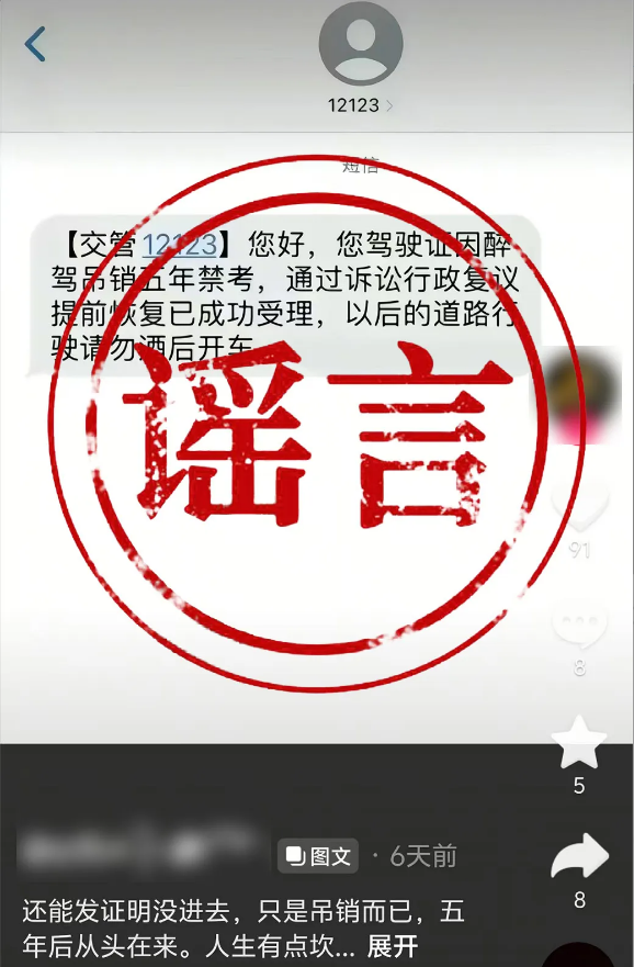 近日,一网民在某平台发布视频称“醉驾五年禁考已通过复议提前恢复”,并附有一张内容不实的交管12123短信截图。